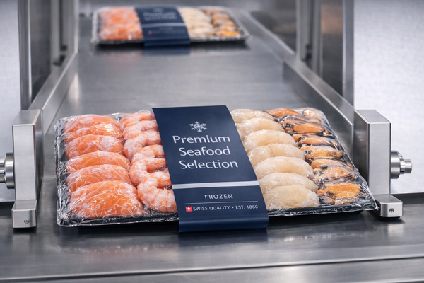 Beim Verpacken von Meeresfrüchten wie Crevetten, Muscheln, Fischfilets oder Mischungen in Schalen sorgt die Banderole für sicheren Halt bei minimalem Materialeinsatz. Statt zusätzlicher Umverpackungen oder grossflächiger Etiketten fixiert die Banderole die Produkte schonend und zuverlässig, ohne sie zu beschädigen.